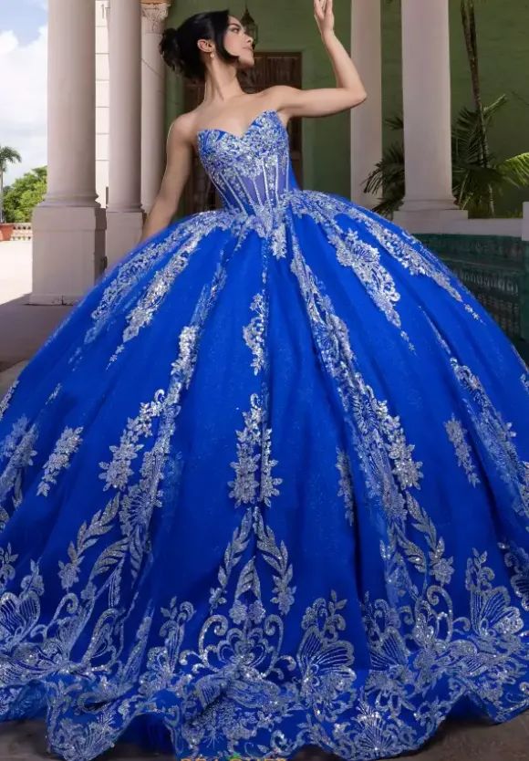 Dance the night away at your special occasion wearing Vizcaya dress 4080021. This unforgettable ballgown features a lovely sweetheart strapless neckline paired with optional off the shoulder cap sleeves. The fitted bodice and full glitter tulle skirt will be sure to have all eyes on you especially when you show off your detachable matching back bow.