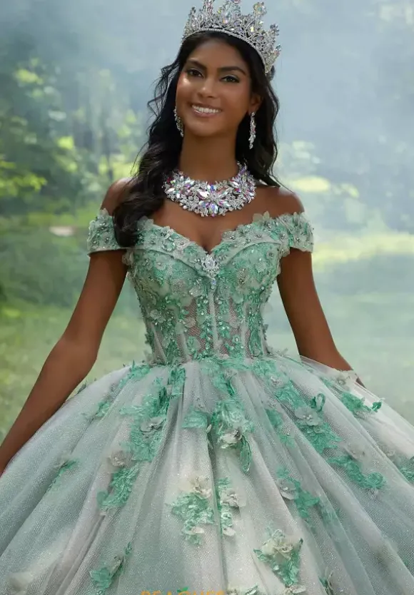 We just love all this gorgeous detail on this Vizcaya ball gown quince dress style 60195. The off the shoulder v neckline has three dimensional flowers that adorn the trim. The sheer illusion bodice continues those flower details and they even trickle down the layered tulle ballgown skirt. Matching stole included.