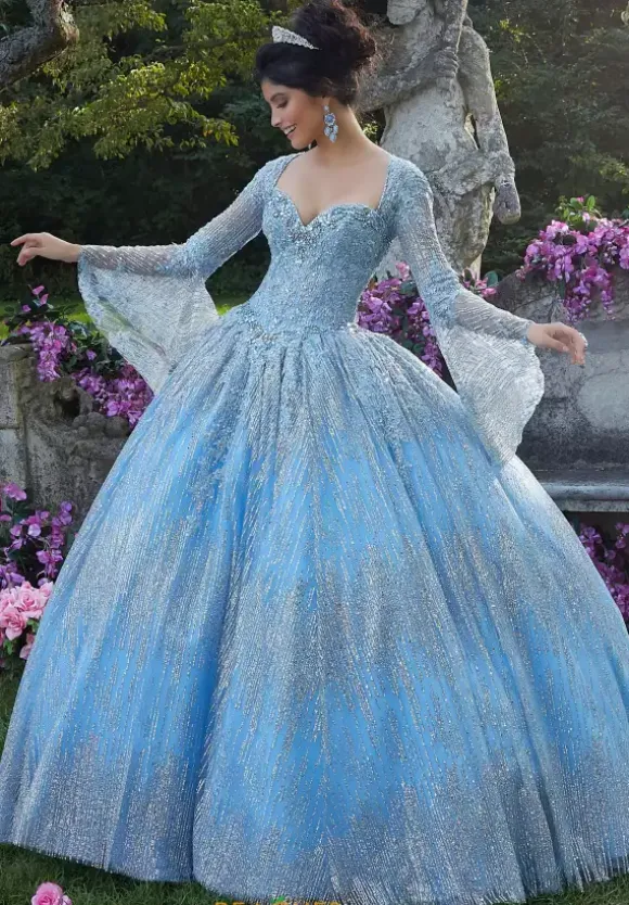 Sensational ball gown dress 89268 exhibits a sweetheart neckline and ravishing long bell sleeves. Create a royaly icy look with this cracked ice gown, designed to have you glistening and gleaming all through the night. The opulent bodice is complimented with radiant beadwork and charming lace embellishments before flowing into a remarkable spectacle of shine and splendor with its grand sweep train and ballgown silhouette.