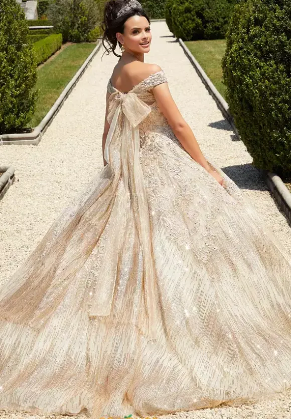 You will look and feel like a princess at your quinceanera while wearing this Vizcaya ball gown 89302. Dipped in glitter from top to bottom this off the shoulder neckline has a details bodice of rhinestones, sequins and beads. In the back of the dress there is a glamorous organza bow over the lace up corset. Shimmering from all angles this glitter skirt has a matching stole that is included.