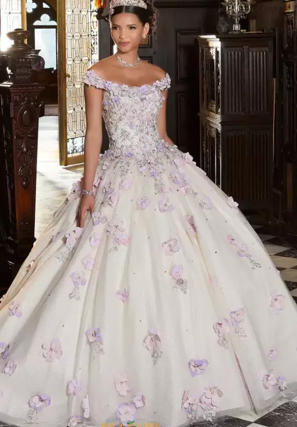 This vintage chic ball gown dress 89341 is adorned with three dimensional flowers making it stand out from the rest. The scoop style neckline showcases off the shoulder cap sleeves. The multi color three dimensional flowers line the neckline and scatter through out the bodice. The full layered glitter tulle skirt brings down those flowers complete this glamorous look.
