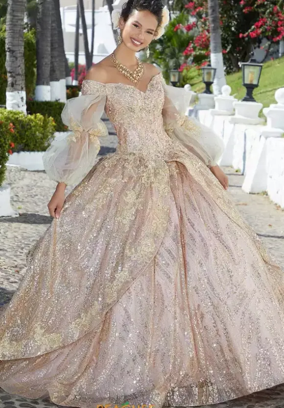 Fashion forward ball gown dress 89361 by Vizcaya will have you feeling like a modern day princess. This exquisite ball gown dress has a v neckline bodice with off the shoulder cap sleeves. Detachable pouf sleeves give you a dual look. Gorgeous sparkling tulle decks the dress from top to bottom with metallic appliques. A matching stole included.