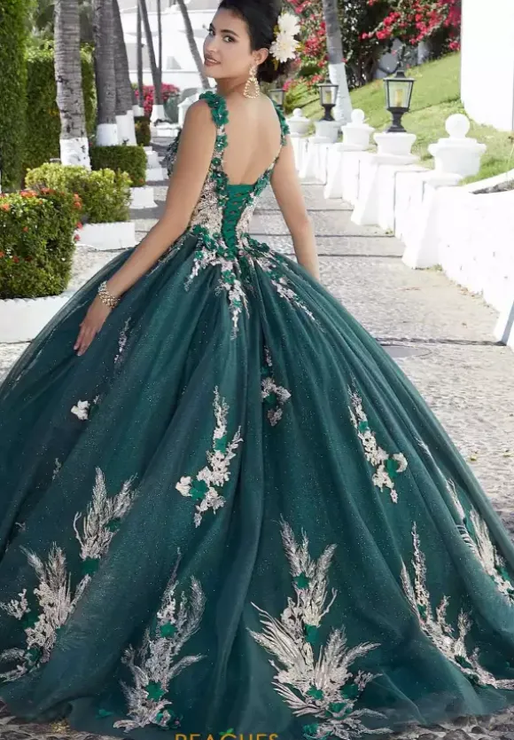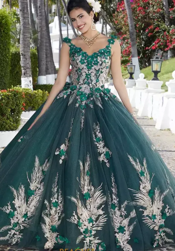 Enchanting Vizcaya ball gown dress 89362 is absolutely stunning. This incredible ball gown showcases a v neckline with thick shoulder straps and an adjustable lace up back. Three dimensional flower details adorn the straps and trickle down the bodice and around the waist line. Metallic appliques deck the hem of the dress. Matching stole and detachable cape included.