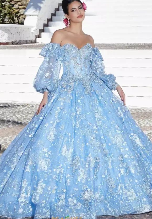 Be on trend in this captivating Vizcaya ball gown 89366 for your next special occasion. This glamorous sweetheart neckline corset bodice has an adjustable lace up in the back. The detachable bishop sleeves amp up the glam factor giving you a two in one look. The full skirt is made from a novelty fabric enriched in embroidery with sequins.