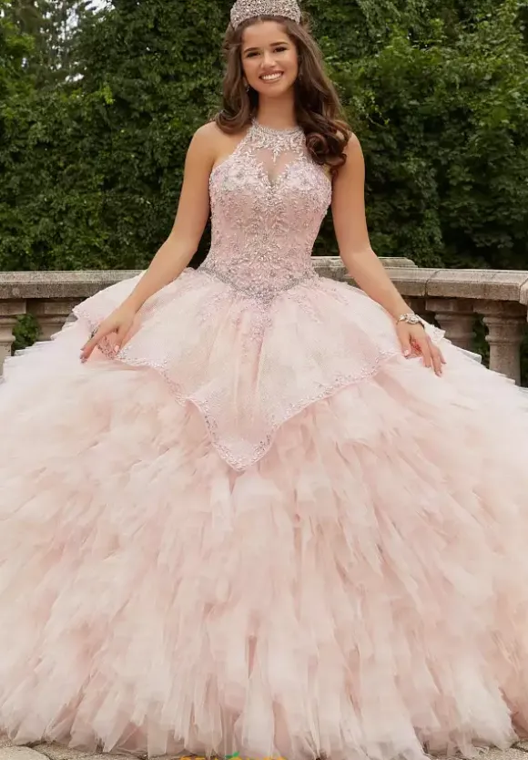 Make a statement in fun ball gown style 89406 by Vizcaya. The corset bodice has a high illusion halter neckline that is adorned in matching beaded patterns that make a transition onto overlay of the ruffled tulle skirt. The voluminous skirt is striking with ruffled pieces of tulle fabric that appear on the sweep train. Matching bolero jacket included.