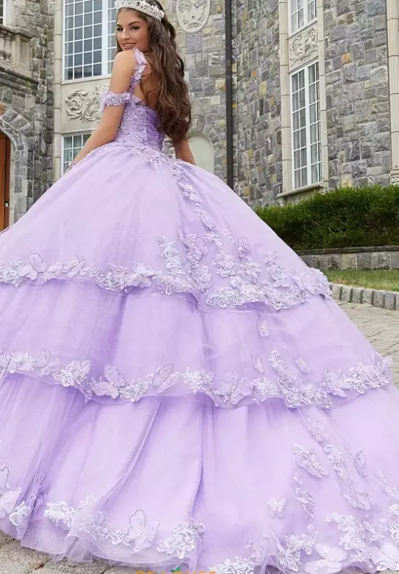 Look and feel like a princess in sophisticated ball gown 89414 by Vizcaya. The corset bodice is entirely adorned in intricate beaded patterns on top of embroidered details. The voluminous skirt features draped layers that are lined with elegant floral and butterfly designs that are featured on the sweep train.