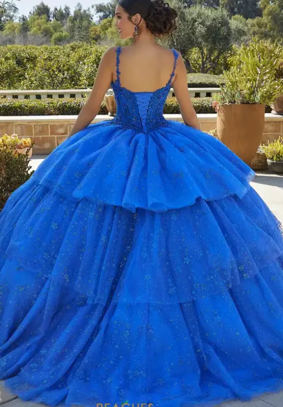 Wow the crowd in regal ball gown dress 89428 by Vizcaya. This exquisite two in one dress includes a matching bolero jacket and detachable patterned glitter tulle ball gown skirt that is adorned in lovely floral patterns. Cinch and adjust the fully beaded corset bodice to your liking with the classic corset lace up.