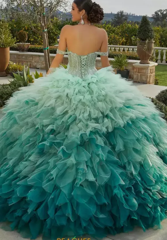 Be the most memorable in unforgettable Vizcaya ball gown dress 89438. Stunning from top to bottom, this traditional style features the elongated corset bodice that is entirely adorned in glistening combinations of beads and sequins. The ruffled skirt is made from different colors of tulle that create a stunning ruffled effect that ends at the sweep train. Matching stole included.