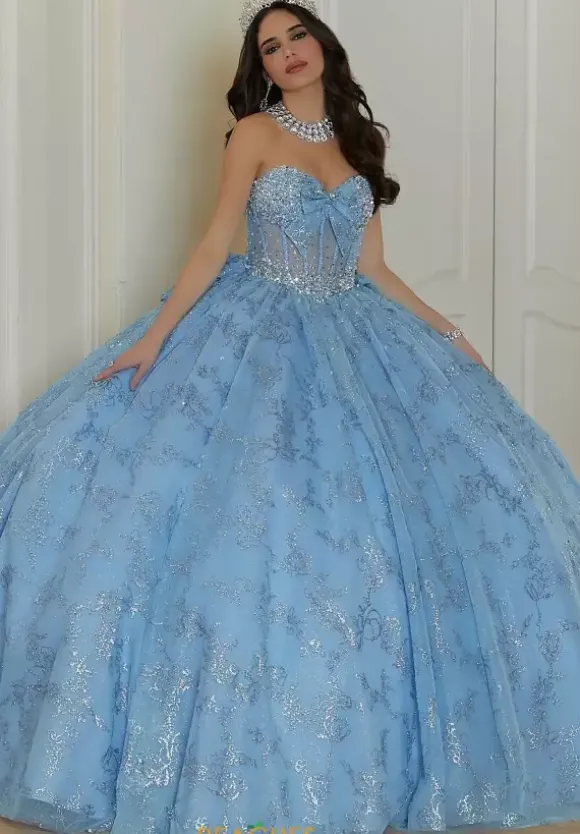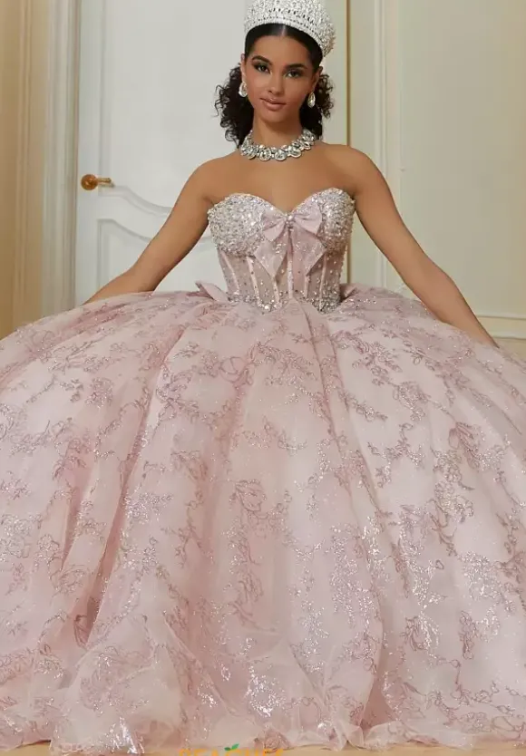 Catch the attention of the crowd upon your entrance in this magical ballgown style 89478 by Vizcaya. The sweetheart neckline is complimented with a fitted illusion corset bodice beautifully detailed with meticulously with beadwork. Glitter applique decorates the entire full tulle skirt for the perfect amount of glisten. Detachable bows and a matching bolero jacket included.
