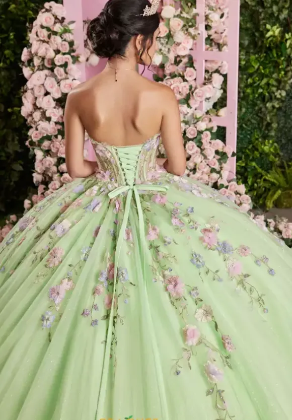 Have a fairy tale moment in this garden inspired ball gown from Vizcaya style 89510. This strapless sweetheart neckline bodice showcases a sheer illusion midriff with gorgeous multi colors floral appliques that adorn to it. The pouf style sleeves are detachable and the matching floral appliques trickles down the waist of the full skirt. A matching stole included.