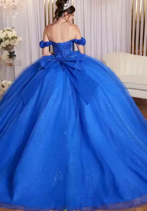 Feel regal in this modern day princess ball gown from Vizcaya style 89523. This sweetheart neckline corset bodice has off the shoulder cap sleeves made from satin rosettes. The bodices is bejeweled with rhinestone and sequins. The full glitter tulle skirt shimmers effortlessly. A detachable bow is in the back with a matching stole included.
