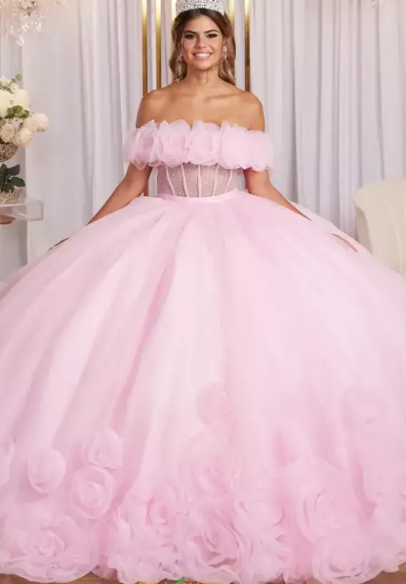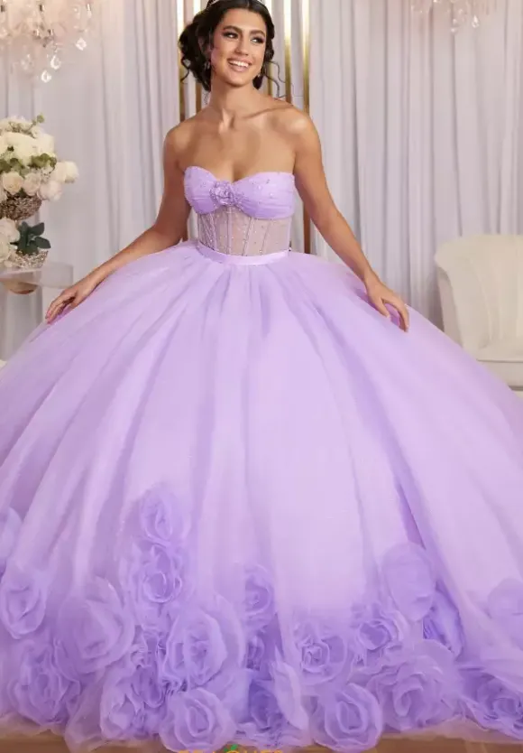 Simply elegant is how you will feel wearing this Vizcaya Quinceanera ball gown style 89524. This strapless sweetheart neckline dress has a sheer illusion boning waistline. Scatters of beadwork adorn the bodice and a lace up in in the back. The full tulle skirt is trimmed with rosettes all along the edging. A detachable 3D floral stole is included.