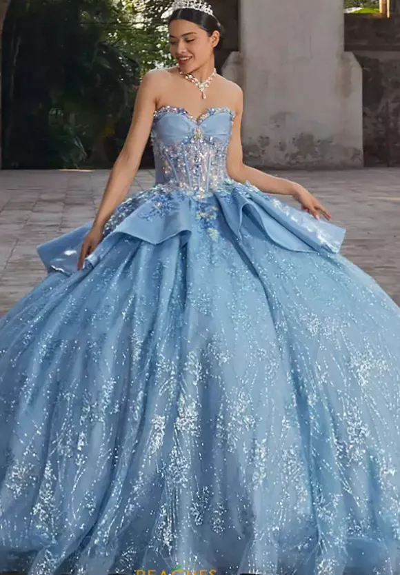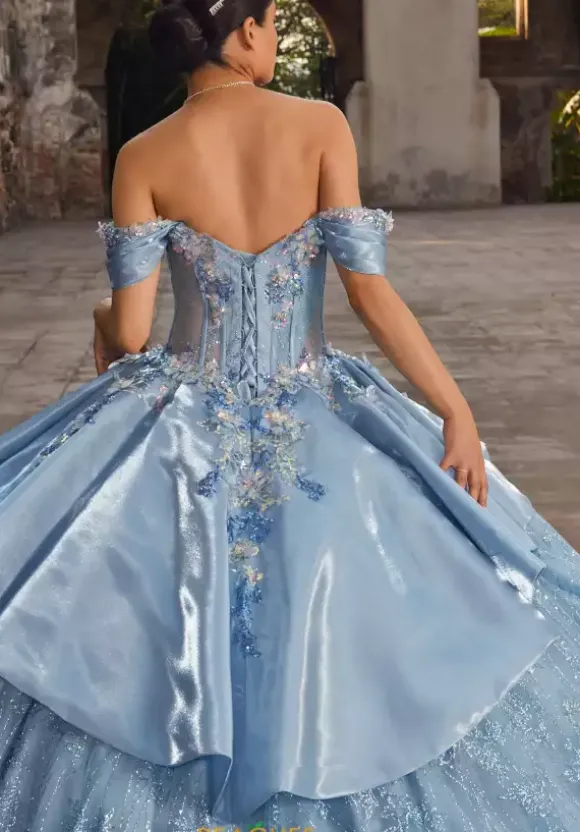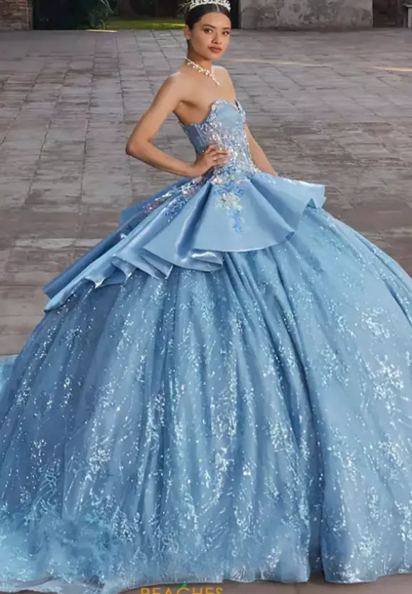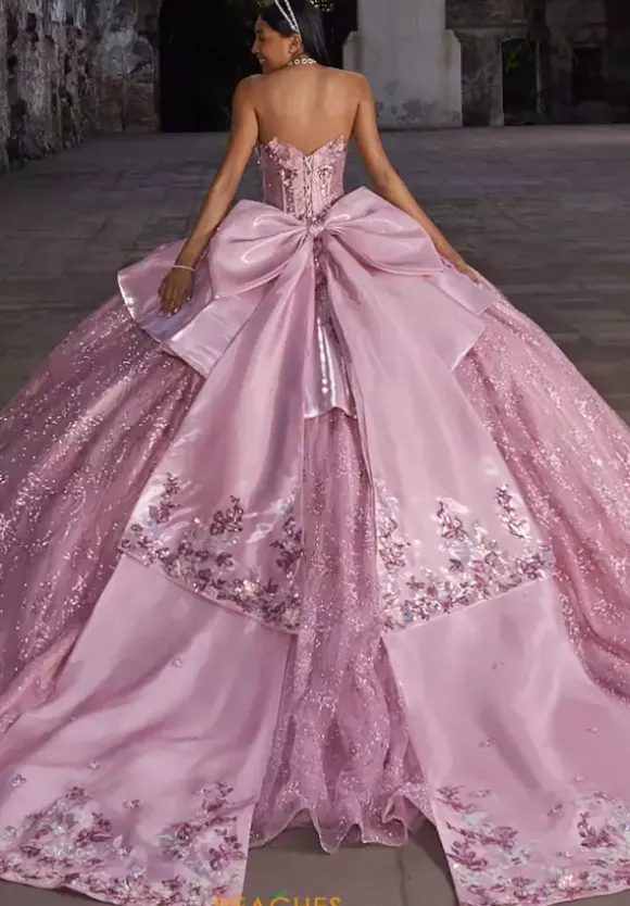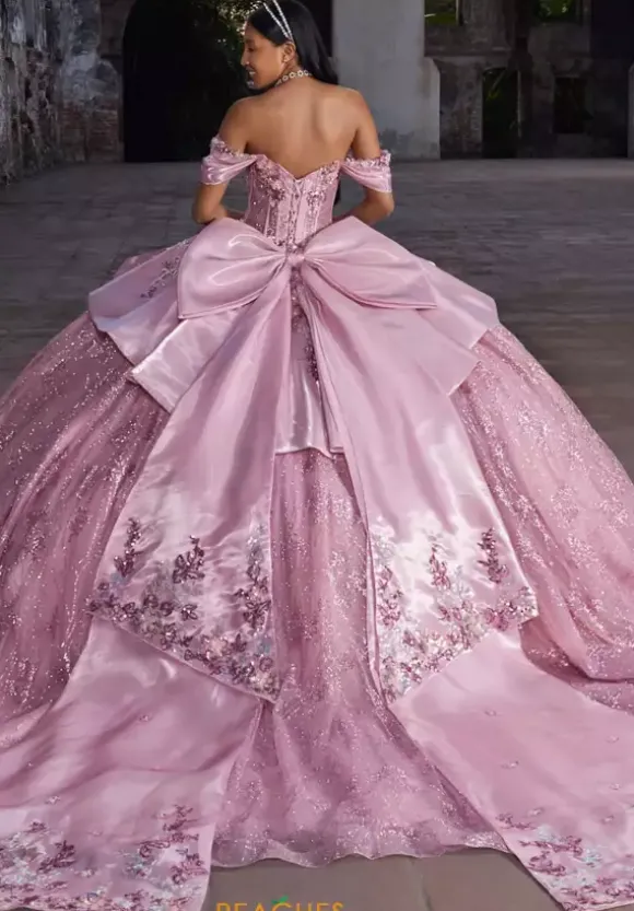 Bring out your inner princess in this one of a kind ball gown by Vizcaya Quinceanera, style 89539. Featuring detachable off-the-shoulder sleeves with a sweetheart neckline. Applique cascades down from the bodice into the beautiful long glitter tulle. A elegant oversized applique bow attached in the back finishes this timeless look.