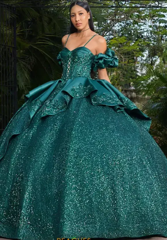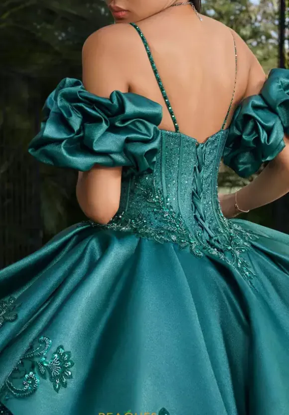 Feel ethereal and unreal in this truly mesmerizing ball gown by Vizcaya Quinceanera, style 89543. Featuring beaded thin straps into a sweetheart neckline with detachable satin puff sleeves. The bodice is beautifully adorned with intricate beadwork and glitter that cascade into the satin glitter train. An oversized double bow made from satin and glitter layer on top of each other to leave a grand exit.