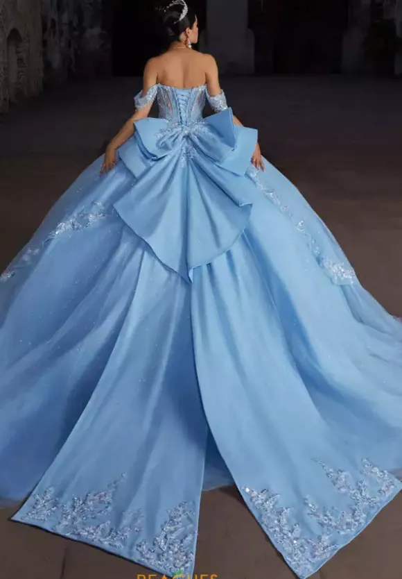Show off your inner princess in this enchanting ballgown by Vizcaya Quinceanera, style 89561. Featuring a sweetheart neckline with draped, detachable off-the-shoulder sleeves, this gown radiates romantic elegance. The bodice is crafted from applique and adorned with delicate beading, giving it a timeless and luxurious feel. The skirt, made from glitter tulle, adds the perfect touch of sparkle. To complete the look, a dramatic, oversized bow at the back makes a jaw-dropping statement.
