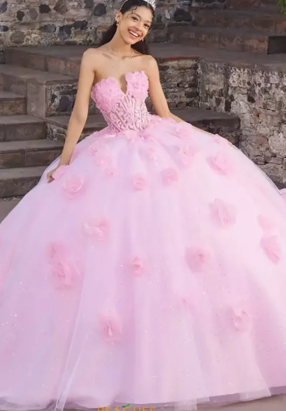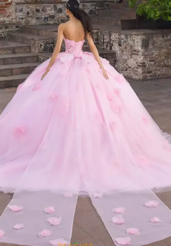 Make a lasting impression in this unforgettable ballgown by Vizcaya Quinceanera, style 89562. Featuring a halter-style strapless V-neckline, exuding modern elegance. The bodice is made from applique and adorned with delicate beading for a captivating finish. The voluminous skirt is made from glitter tulle and accented with glitter tulle roses, adding texture and sparkle throughout. A long, detachable halter neck tie adds a versatile touch, style it around the neck or the waist for a chic bow effect that completes the look.