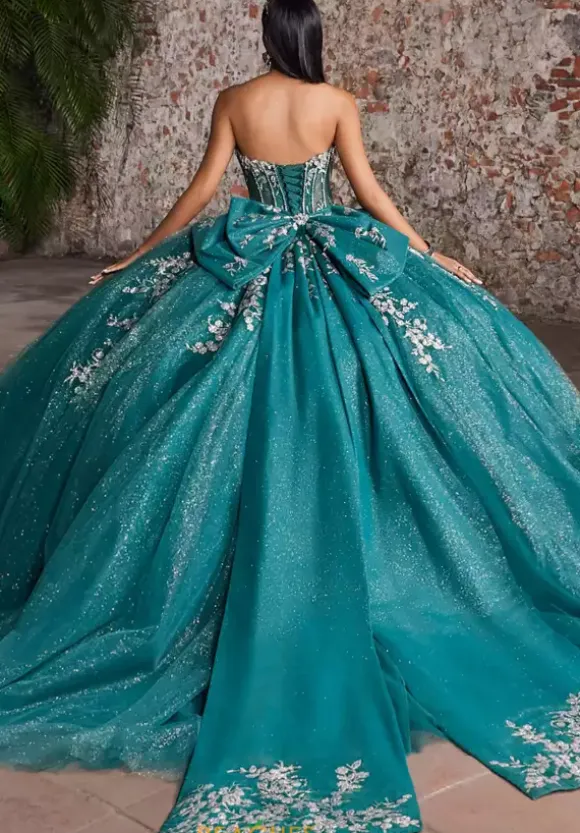 Be the spotlight of the night in this truly captivating ballgown by Vizcaya Quinceanera, style 89563. Featuring a endearing sweetheart neckline with off-the-shoulder straps exuding elegance. Bold beading paired with intricate applique adorns the corset and flows seamlessly into the long glitter tulle train. Completing the look, a dramatic bow cascades to match the length of the train. For an unforgettable entrance, a detachable high collar with scalloped detailing adds a regal touch that’s sure to leave everyone in awe as they see you.